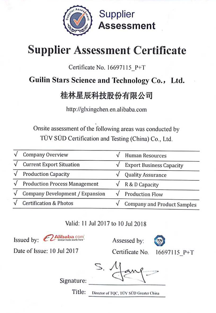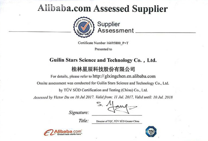 桂林星辰科技股份有限公司于2017年7月11日獲得了德國TüV南德意志集團(tuán)的權(quán)威認(rèn)證證書。這標(biāo)志著星辰科技股份將會在歐洲乃至全球得到生產(chǎn)廠商、供應(yīng)商及各國認(rèn)證機(jī)構(gòu)的廣泛認(rèn)可;同時,桂林星辰科技股份也得到了阿里巴巴國際站“金品誠企”的榮譽(yù)稱號,為星辰科技股份開辟海外市場,拓展國際貿(mào)易業(yè)務(wù),提升產(chǎn)品市場競爭力,獲取更高的國際關(guān)注度提供了強(qiáng)有力地保障。