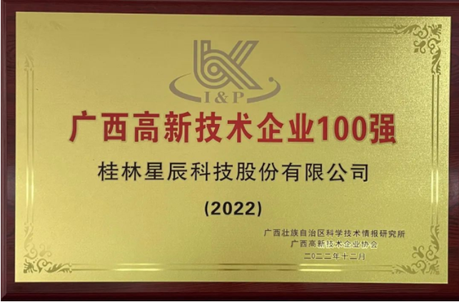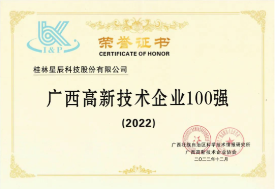 近日,廣西科技廳發(fā)布了2022年廣西高新技術(shù)企業(yè)百強(qiáng)榜單,桂林星辰科技股份有限公司成功入選“廣西高新技術(shù)企業(yè)100強(qiáng)”。